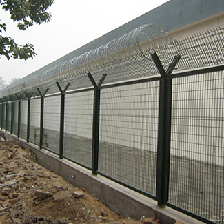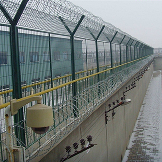 立柱頂端設(shè)有Y型叉與刀刺網(wǎng)(分為熱鍍鋅刀刺網(wǎng)與304不銹刺網(wǎng))選配安裝