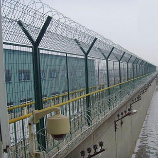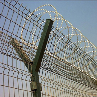 三:鋼絲焊接的網(wǎng)片采用低碳鋼絲焊接而成,表面采用pvc浸塑處理,與刀刺網(wǎng)連接。